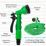 pensé que era chamuyo pero posta se estira un montón y no se enreda. para regar meto el chorro “fino” y sale potente, y para lavar el auto uso el “ducha” y no marca la pintura. livianita y no ocupa nada.
